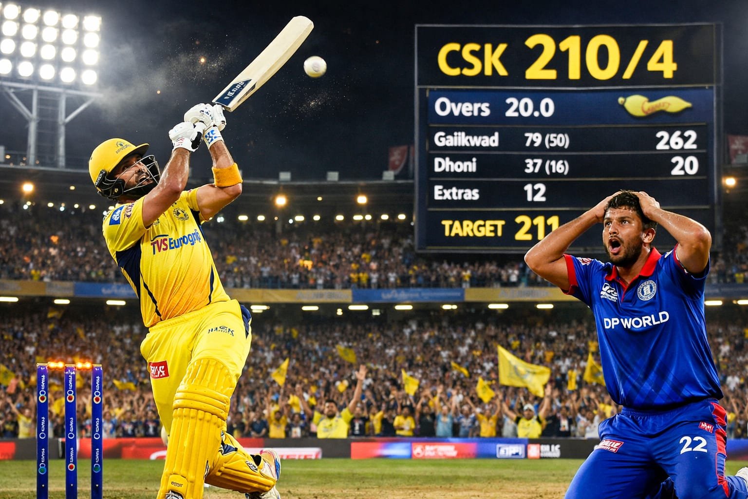 CSK ਨੇ ਪਹਿਲਾਂ ਬੱਲੇਬਾਜ਼ੀ ਕਰਦੇ ਹੋਏ ਸ਼ਾਨਦਾਰ ਪ੍ਰਦਰਸ਼ਨ ਕੀਤਾ। ਟੀਮ ਨੇ 20 ਓਵਰਾਂ ਵਿੱਚ 212 ਰਨਾਂ ਦਾ ਵੱਡਾ ਸਕੋਰ ਬਣਾਇਆ, ਜੋ IPL ਦੇ ਇਸ ਸੀਜ਼ਨ ਵਿੱਚ ਸਭ ਤੋਂ ਮਜ਼ਬੂਤ ਸਕੋਰਾਂ ਵਿੱਚੋਂ ਇੱਕ ਹੈ।